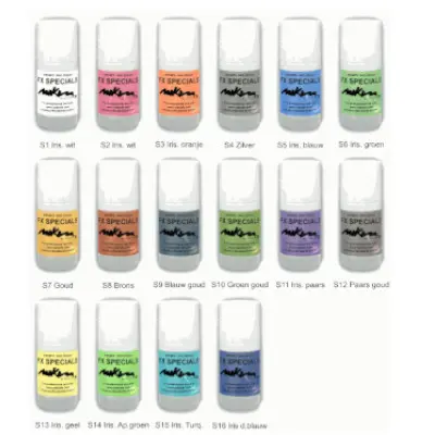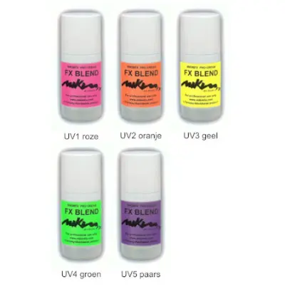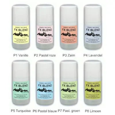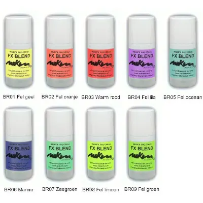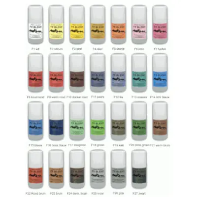 | Kleuren Schmink | F1 Wit, F2 Citroen, F3 Geel, F4 Oker, F5 Oranje, F6 Roze, F7 Fushia, F8 Koud Rood, F9 Warm Rood, F10 Donker Rood, F11 Paars, F12 Lila, F13 Zeeblauw, F14 Lichtblauw, F15 Blauw, F16 Donkerblauw, F17 Zeegroen, F18 Lente, F19 Legergroen, F20 Donkergroen, F21 Warm Bruin, F22 Rood Bruin, F23 Bruin, F24 Donkerbruin, F25 Ivoor, F26 Grijs, F27 Zwart |