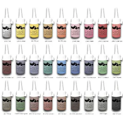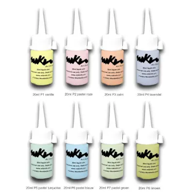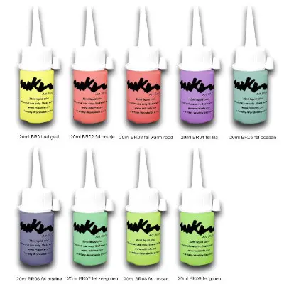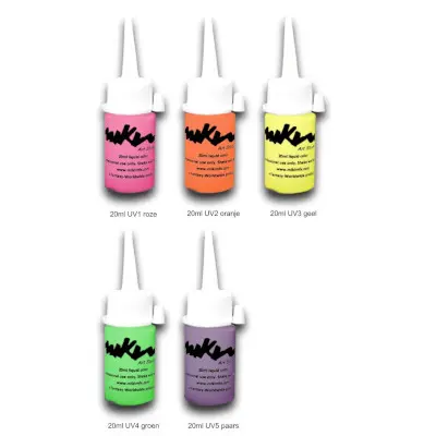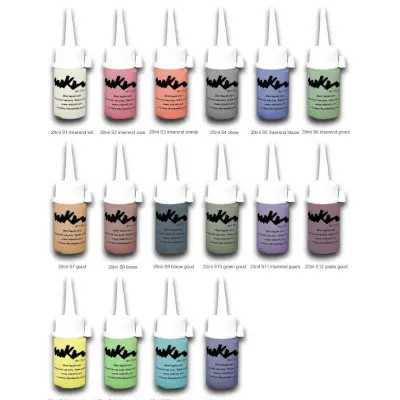 | Kleuren Schmink | S1 Iriserend Wit, S2 Iriserend Roze, S3 Iriserend Oranje, S4 Zilver, S5 Iriserend Blauw, S6 Iriserend Groen, S7 Goud, S8 Koper, S9 Goud Blauw, S10 Goud Groen, S11 Iriserend Paars, S12 Goud Paars, S13 Iriserend Geel, S14 Iriserend Groen, S15 Iriserend Turquoise, S16 Iriserend Donkerblauw |